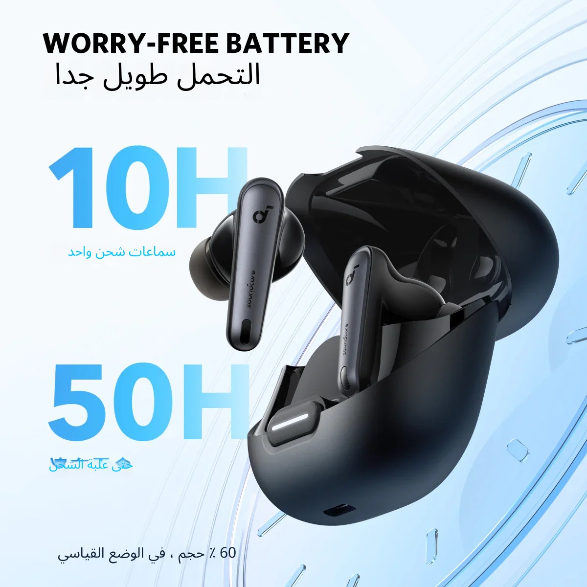 - وقت الاستخدام (السماعات/مع علبة الشحن): يصل إلى 10/50 ساعة (قياسي)؛ يصل إلى 8/40 ساعة (ANC)؛ يصل إلى 4/20 ساعة (وقت المكالمة)