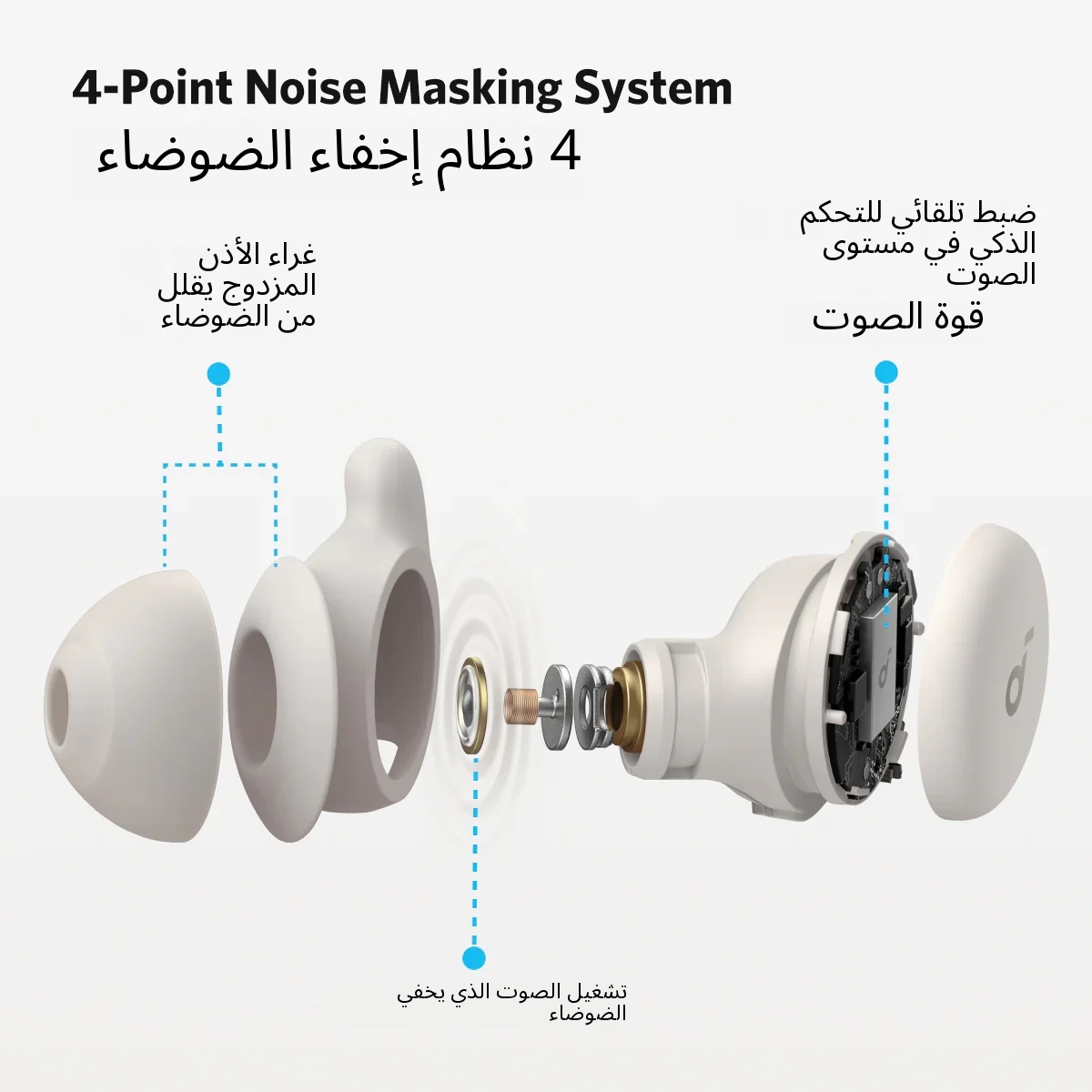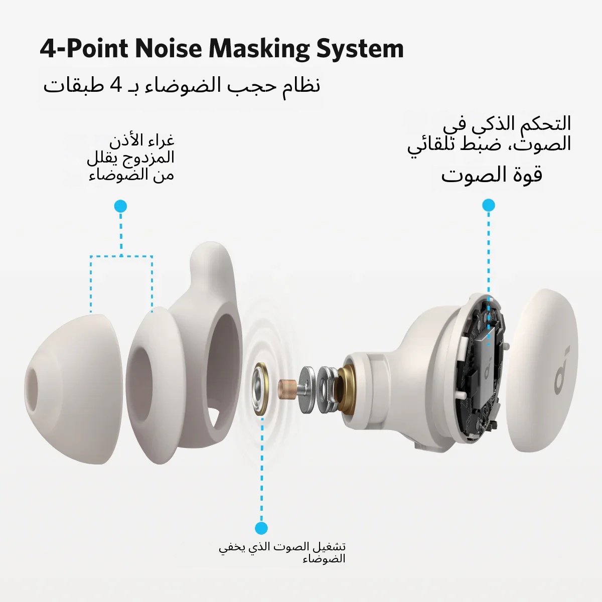 يستخدم نظام إخفاء الضوضاء من 4 طبقات، وتوفر جل الأذن المزدوج الطبقة تأثير تقليل الضوضاء السلبي الثلاثي. بالإضافة إلى تقنية صوت النوم لإخفاء الضوضاء وتقنية التحكم الذكي في مستوى الصوت، فإنه يحجب الأصوات المزعجة بفعالية.