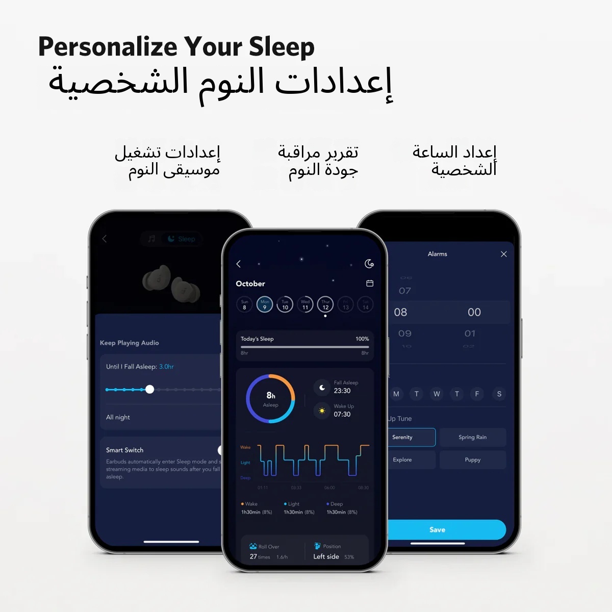 يتتبع Sleep A20 وضعية نومك، الحركات أثناء النوم، ومدة وقت النوم من خلال مستشعرات MEMS في سماعات الأذن والمنبه في الوقت الفعلي، مما يسمح لك بفهم عادات نومك بشكل أفضل وتحديد مجالات تحسين النوم.