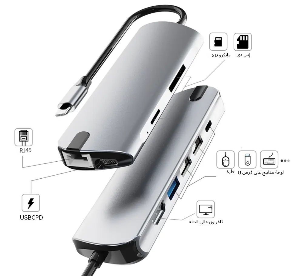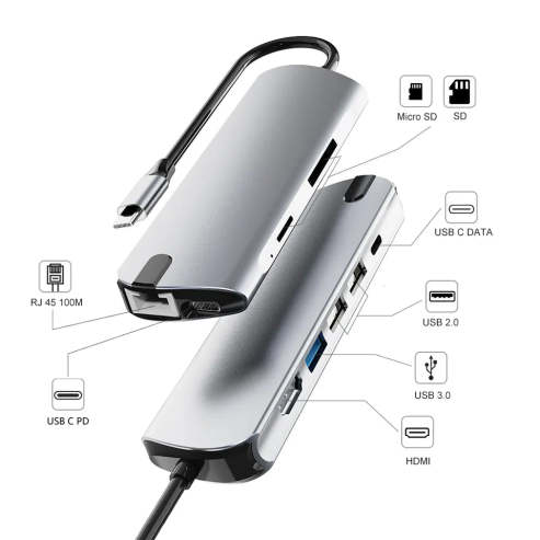 - مزود بـ 9 منافذ، بما في ذلك HDMI وكابل شبكة RJ45 وفتحة بطاقة SD وفتحة بطاقة Micro SD ومنفذ شحن Type C PD ومنفذين USB3.0