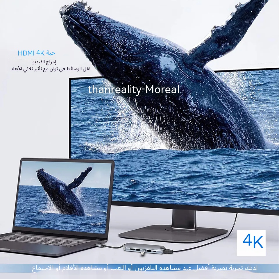 تشمل منافذ التوسيع الثمانية منفذ HDMI يدعم إخراج فيديو وصوت حتى 4K/30Hz؛ توفر ثلاثة منافذ USB3.0 دعمًا لنقل بيانات حتى 5 جيجابت في الثانية؛ يدعم منفذ Type C شحن PD حتى 100 واط (يتم حجز 6 واط للمنافذ الأخرى);يدعم منفذ RJ45 سرعة شبكة حتى 1000 ميجابت في الثانية؛ يدعم قارئ بطاقة SD/Micro SD نقل بيانات حتى 5 جيجابت في الثانية.