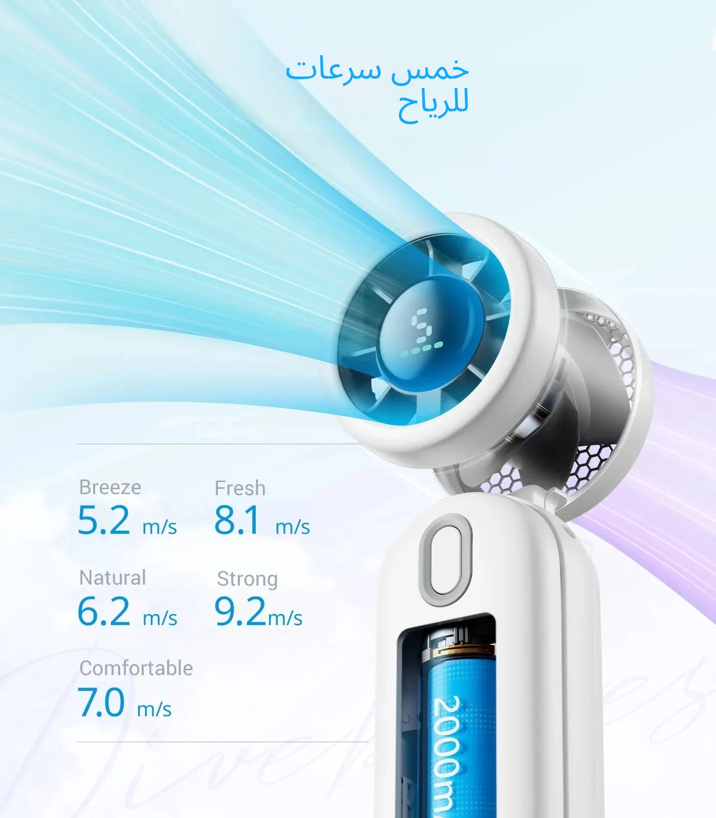 .LEDالشاشة تعرض المعلومات الرقمية، مما يسمح لك بالتحقق من سرعة الرياح ومستوى البطارية في نفس الوقت.