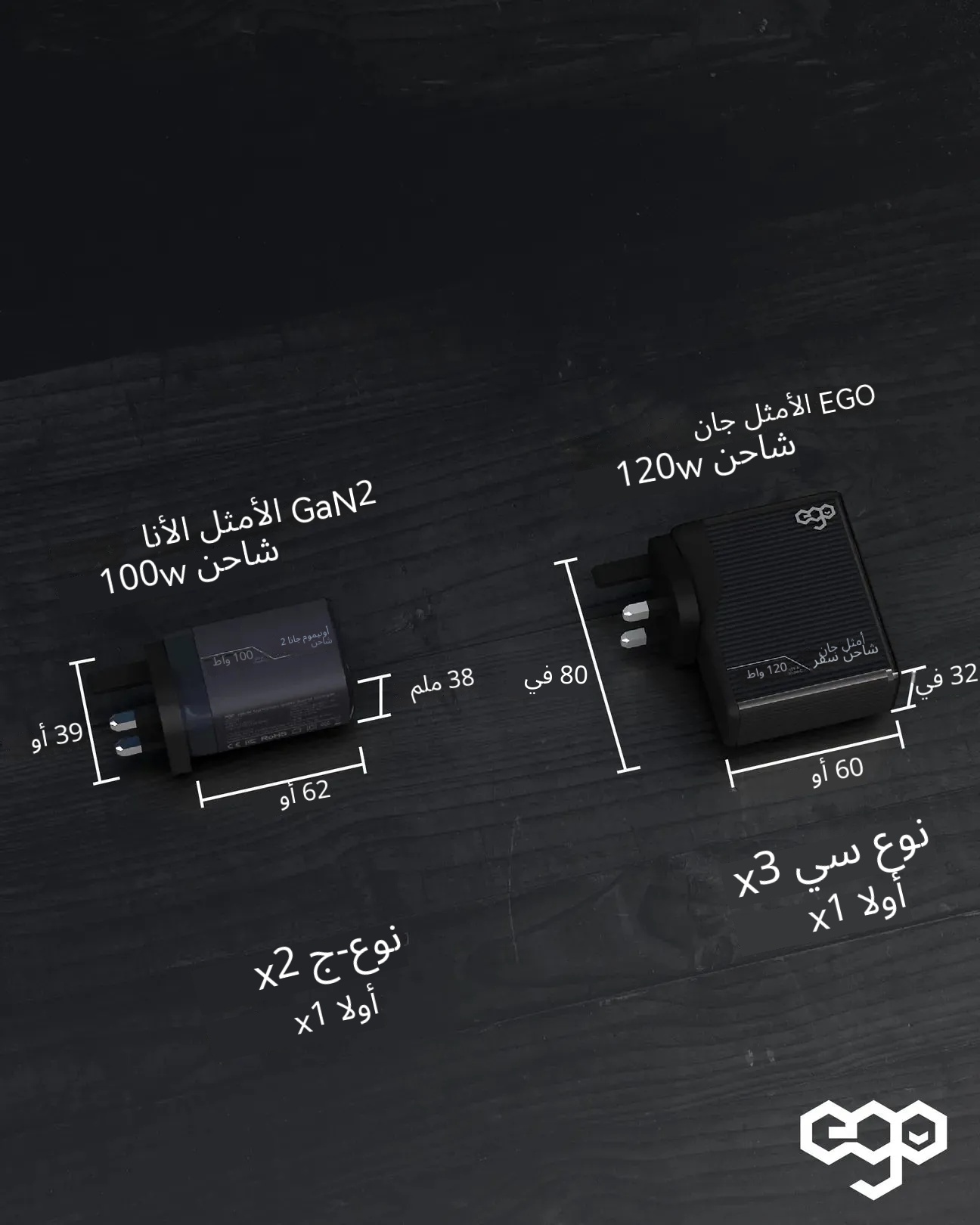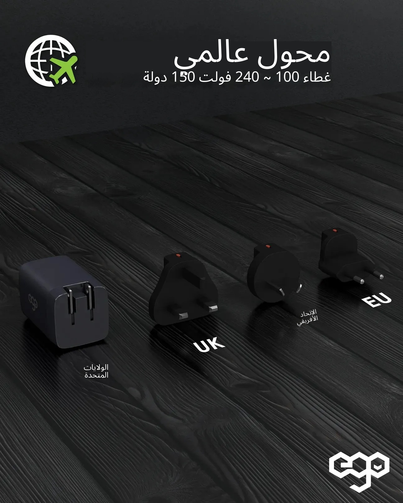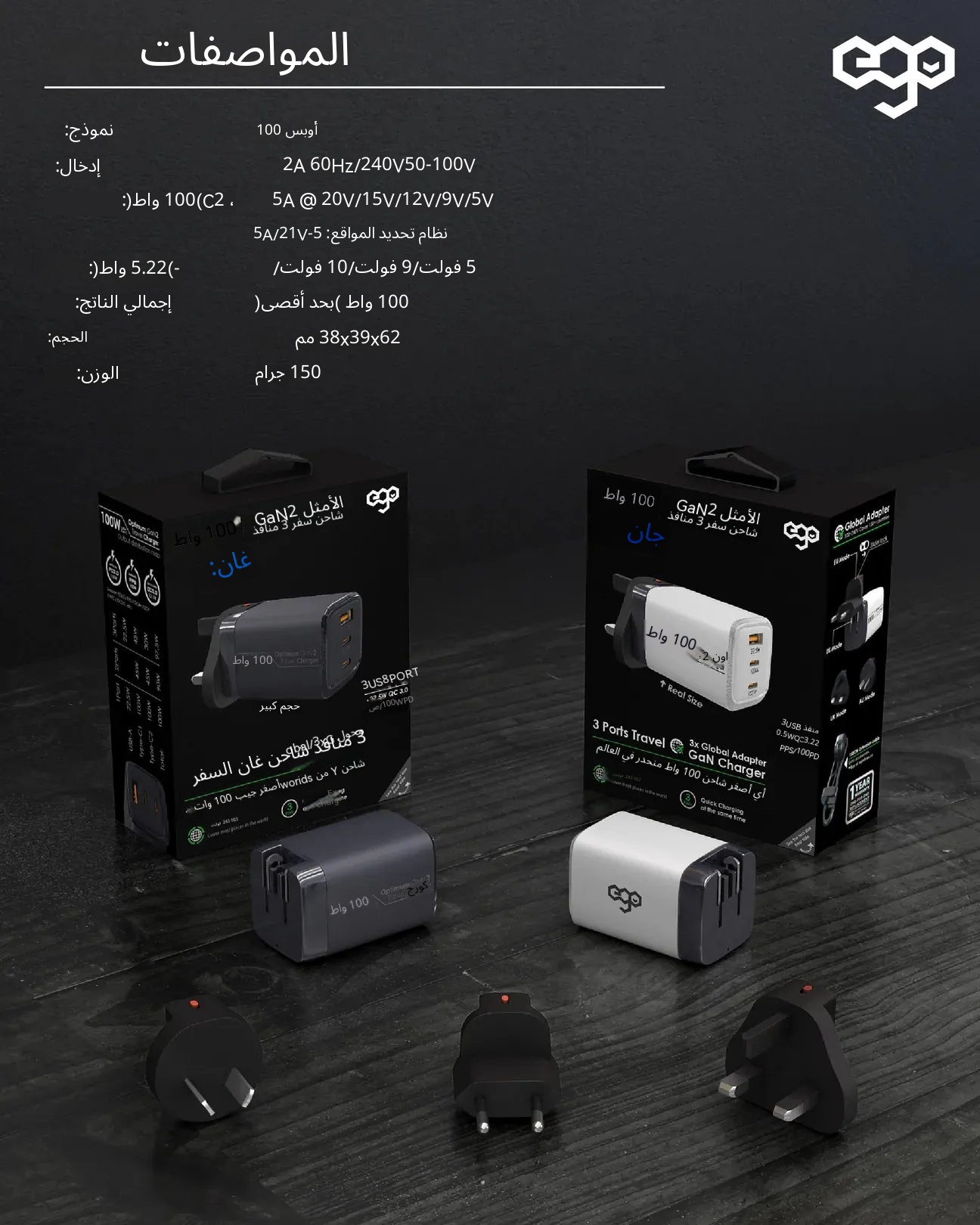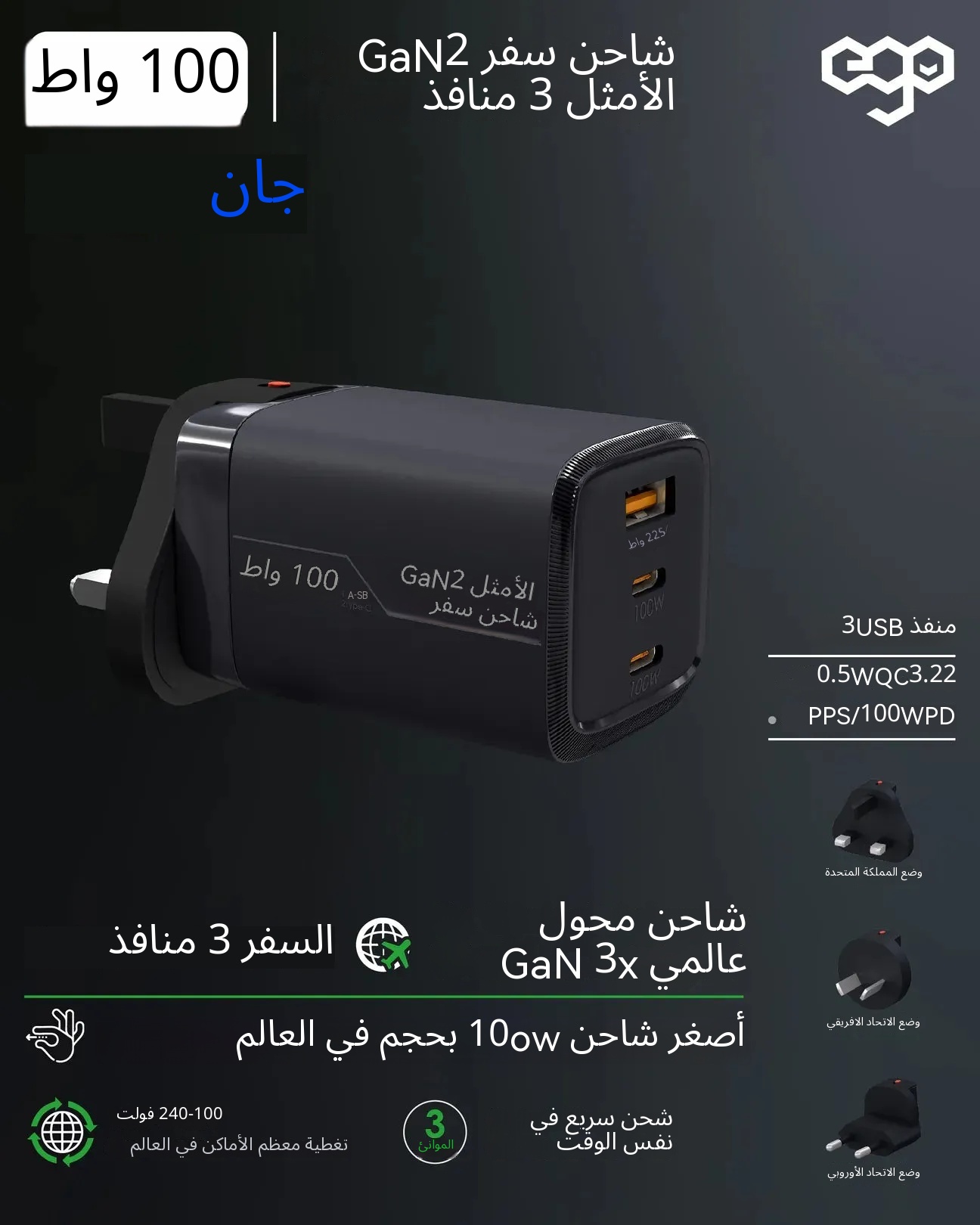 شاحن EGO 100W Optimum GaN2 أصغر شاحن 100 واط في العالم حجم فائق الصغر، يأتي مع مجموعة محولات سفر * الوحدة الرئيسية مزودة بـ 3 قابس سفر، يجب شراء سلك التمديد بشكل منفصل * 1. أصغر شاحن 100 واط في العالم…