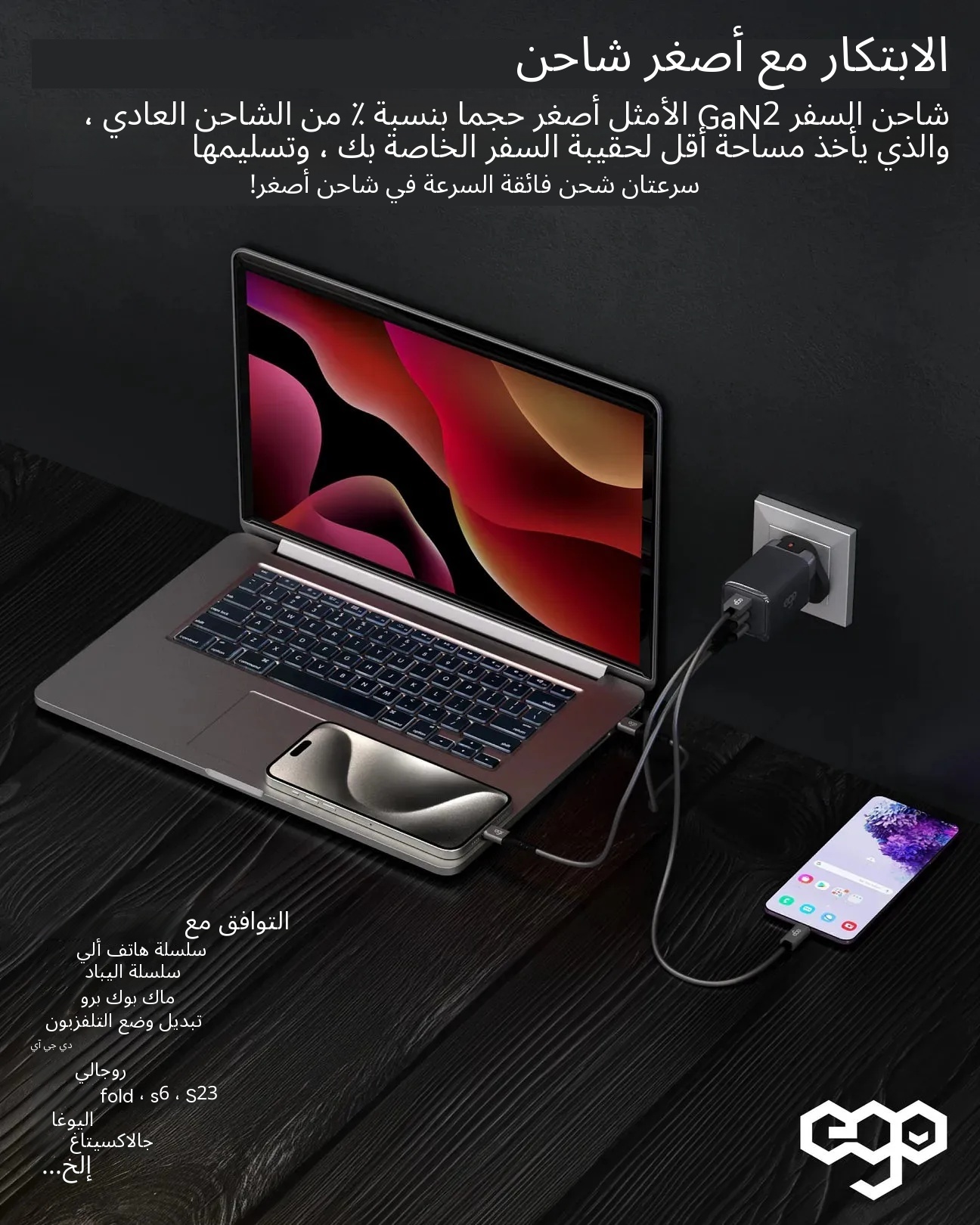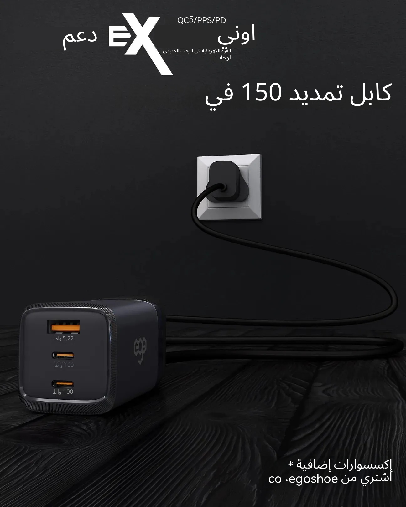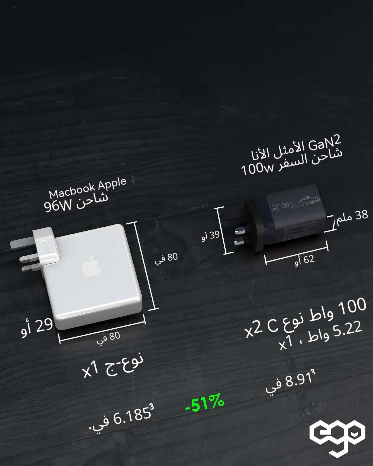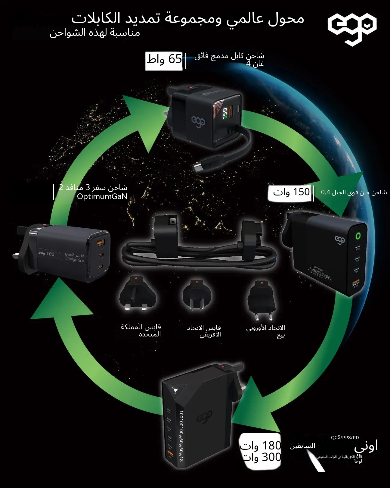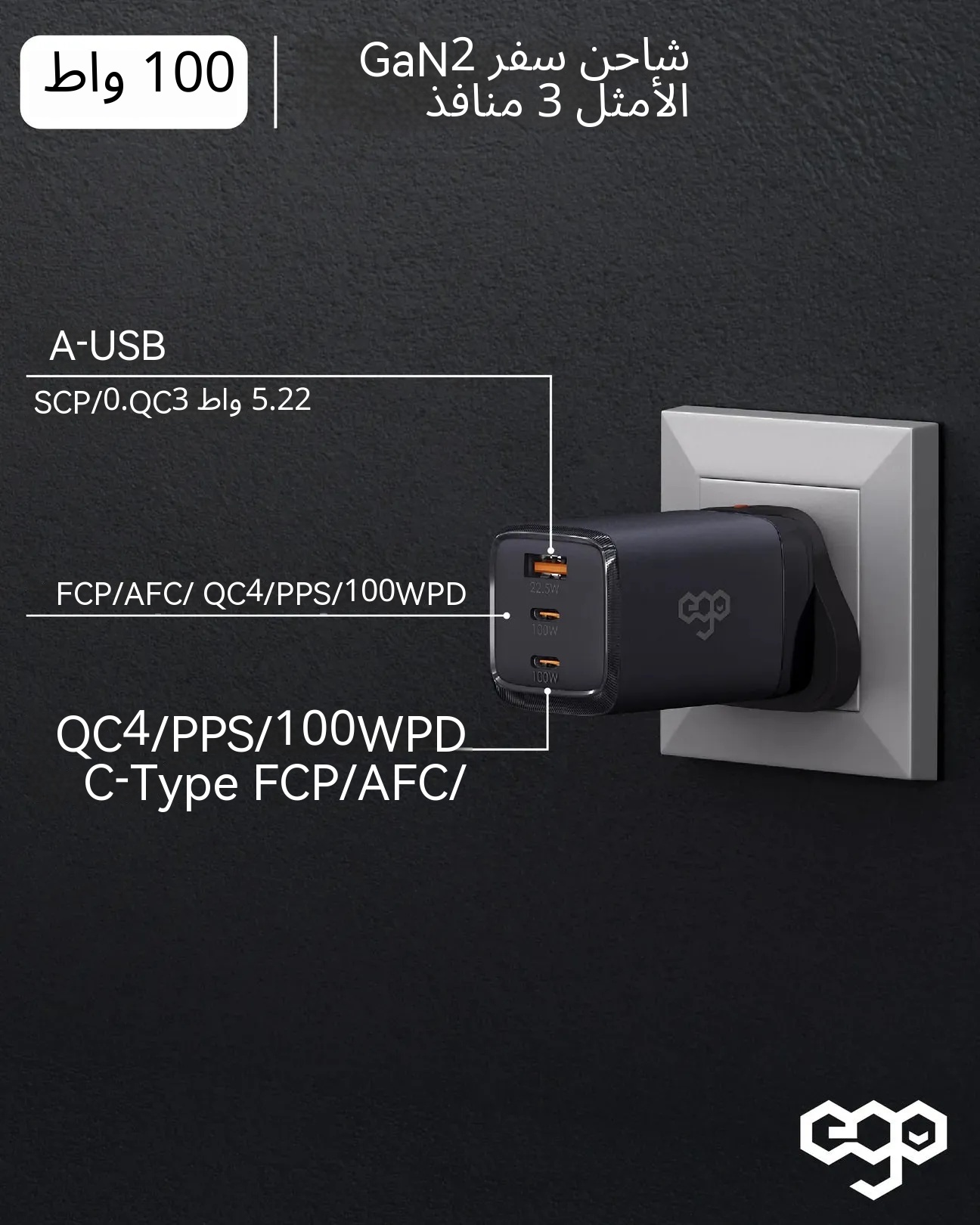 شاحن EGO 100W Optimum GaN2 أصغر شاحن 100 واط في العالم حجم فائق الصغر، يأتي مع مجموعة محولات سفر * الوحدة الرئيسية مزودة بـ 3 قابس سفر، يجب شراء سلك التمديد بشكل منفصل * 1. أصغر شاحن 100 واط في العالم…