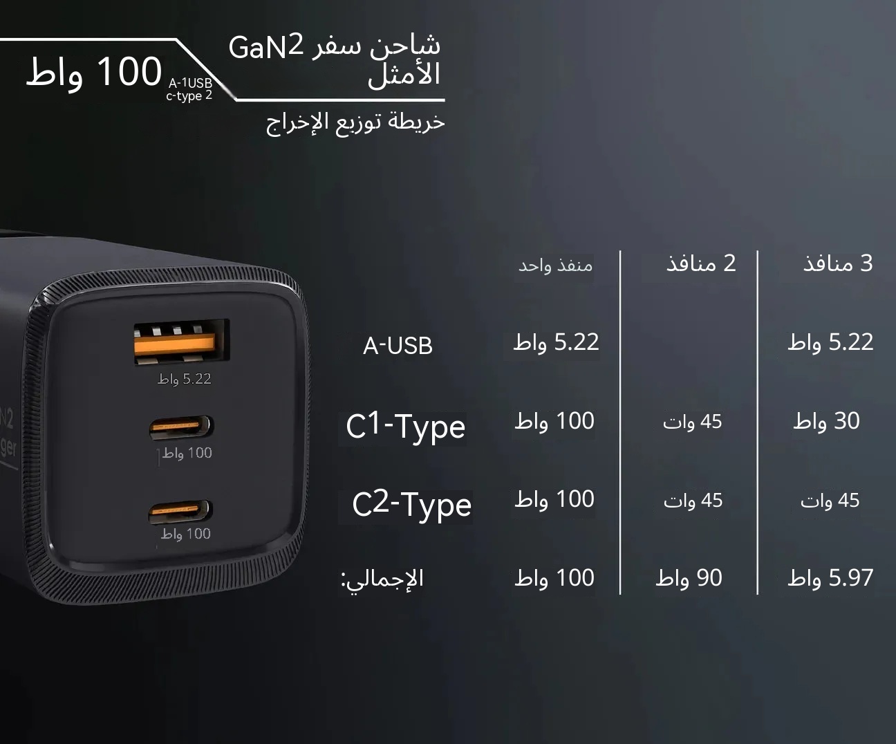 | Type-C1/C2 (100W): | 5V/9V/12V/15V/20V@5A PPS:5-21V/5A |