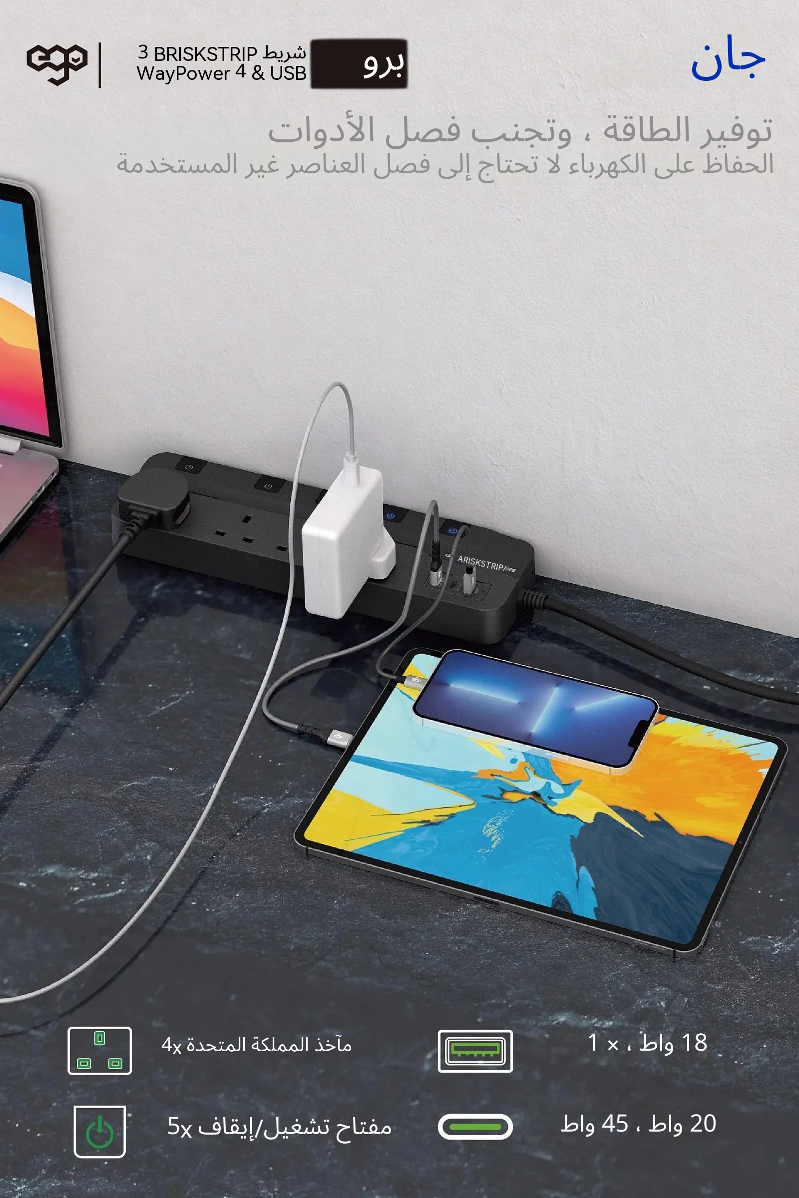 لوحة تمديد EGO BRISK STRIP PRO GAN PD45w بـ 3 منافذ USB وحماية من الصواعق 4 مراكز من النوع C