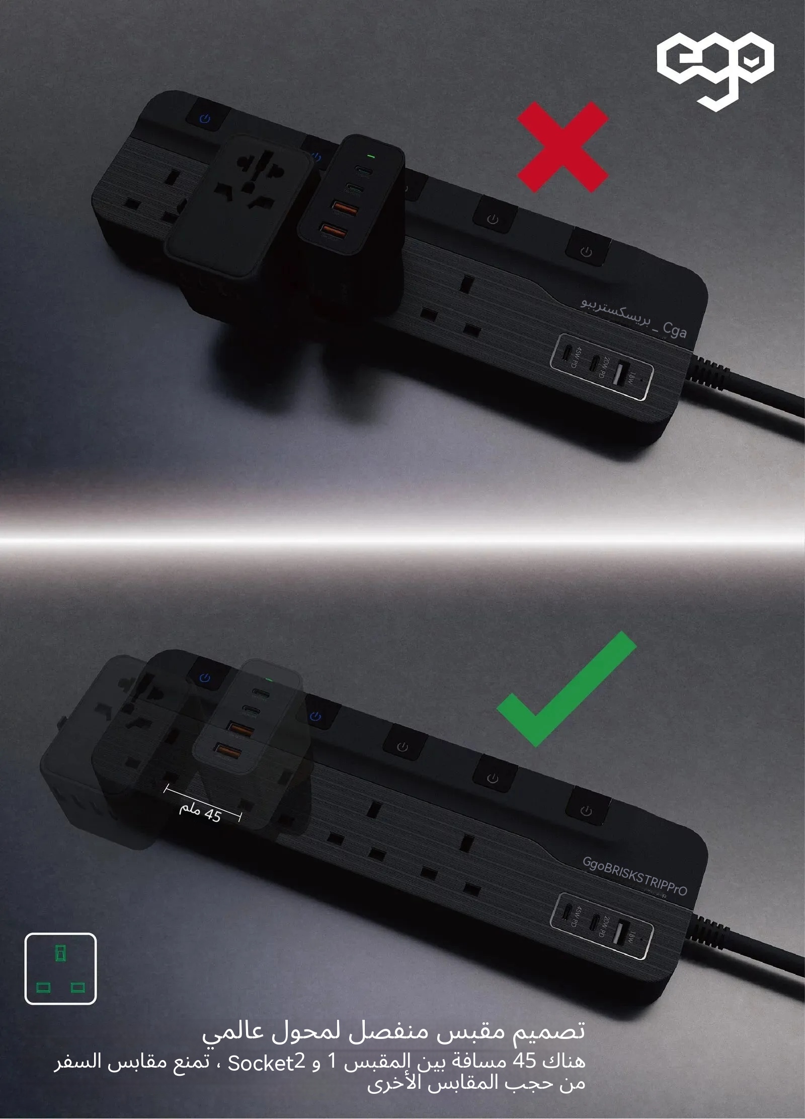 EGO BRISK STRIP الإصدار الاحترافي GaN 3USB & 4 Socket Power Strip