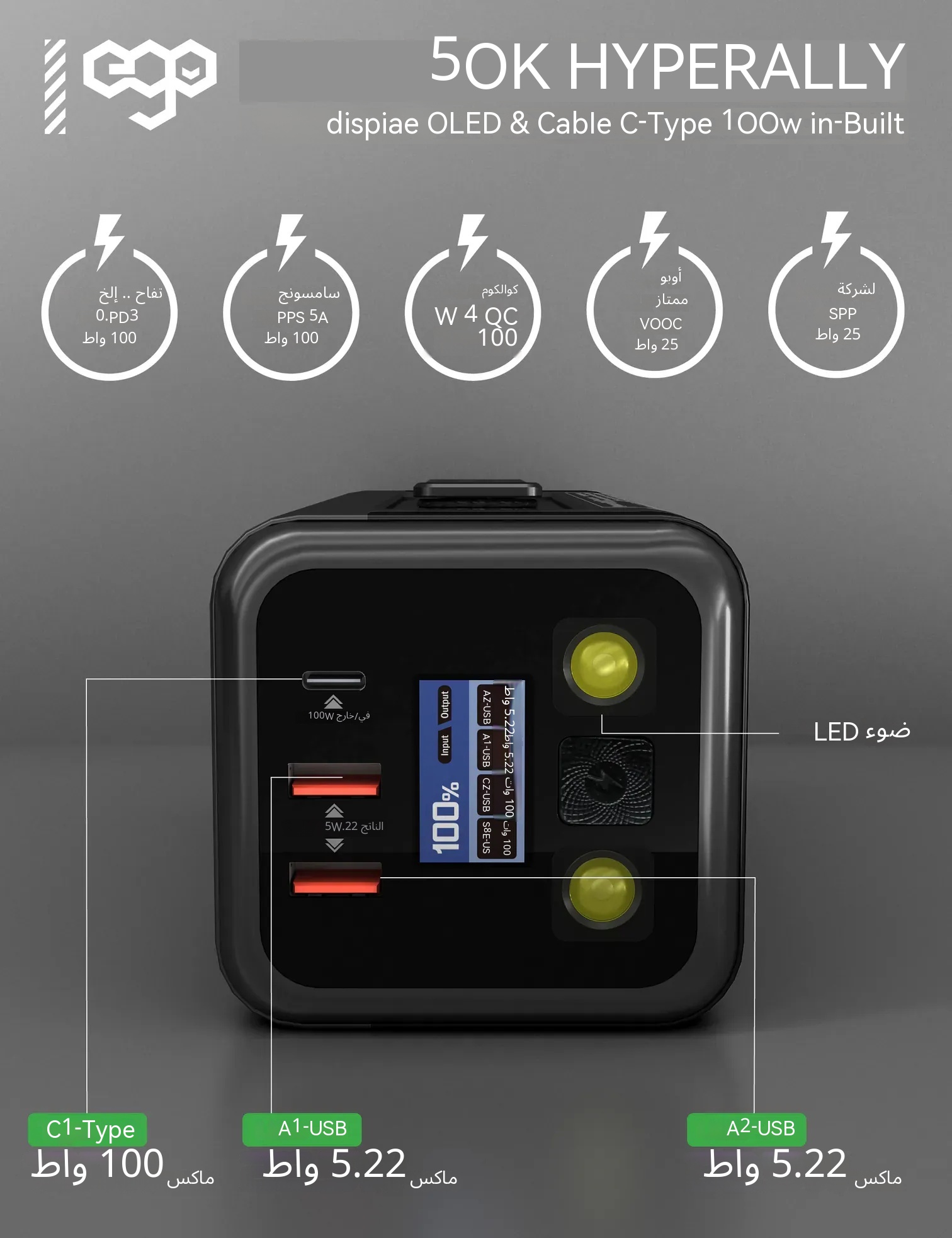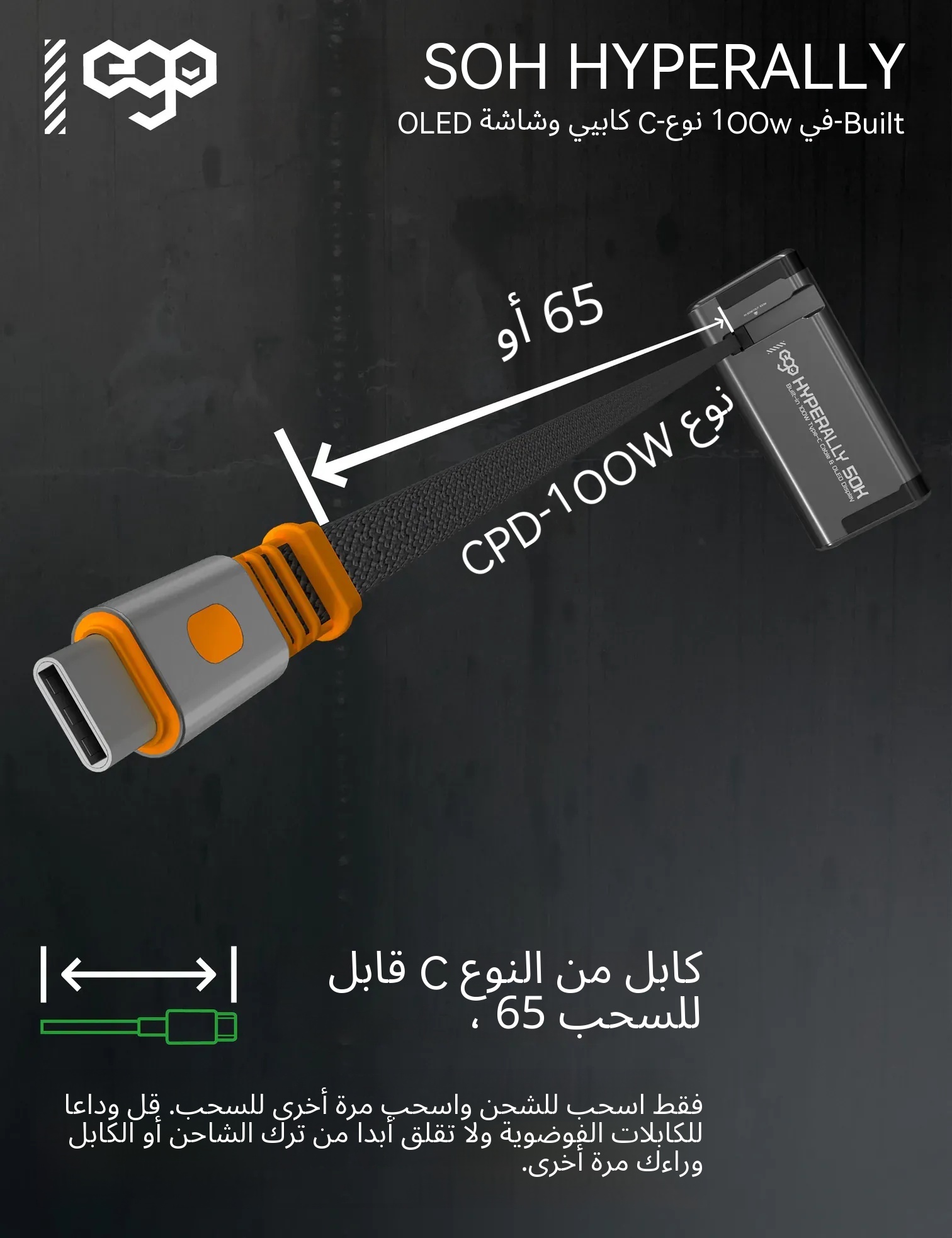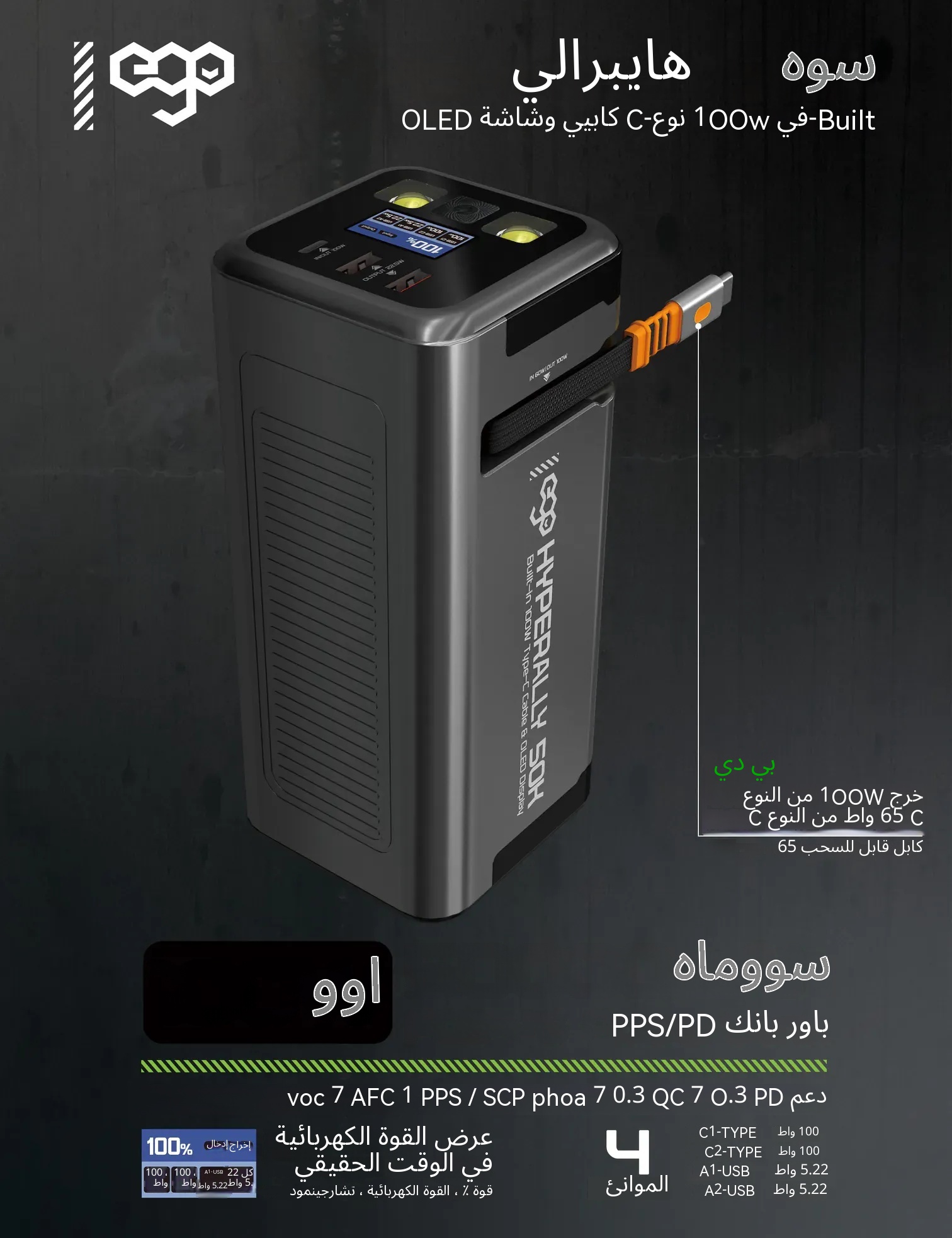 سعة بطارية كبيرة / شحن سريع 100W / شاشة OLED للمعلومات / كابل قابل للسحب مدمج بطول 65 سم / إضاءة LED مزدوجة