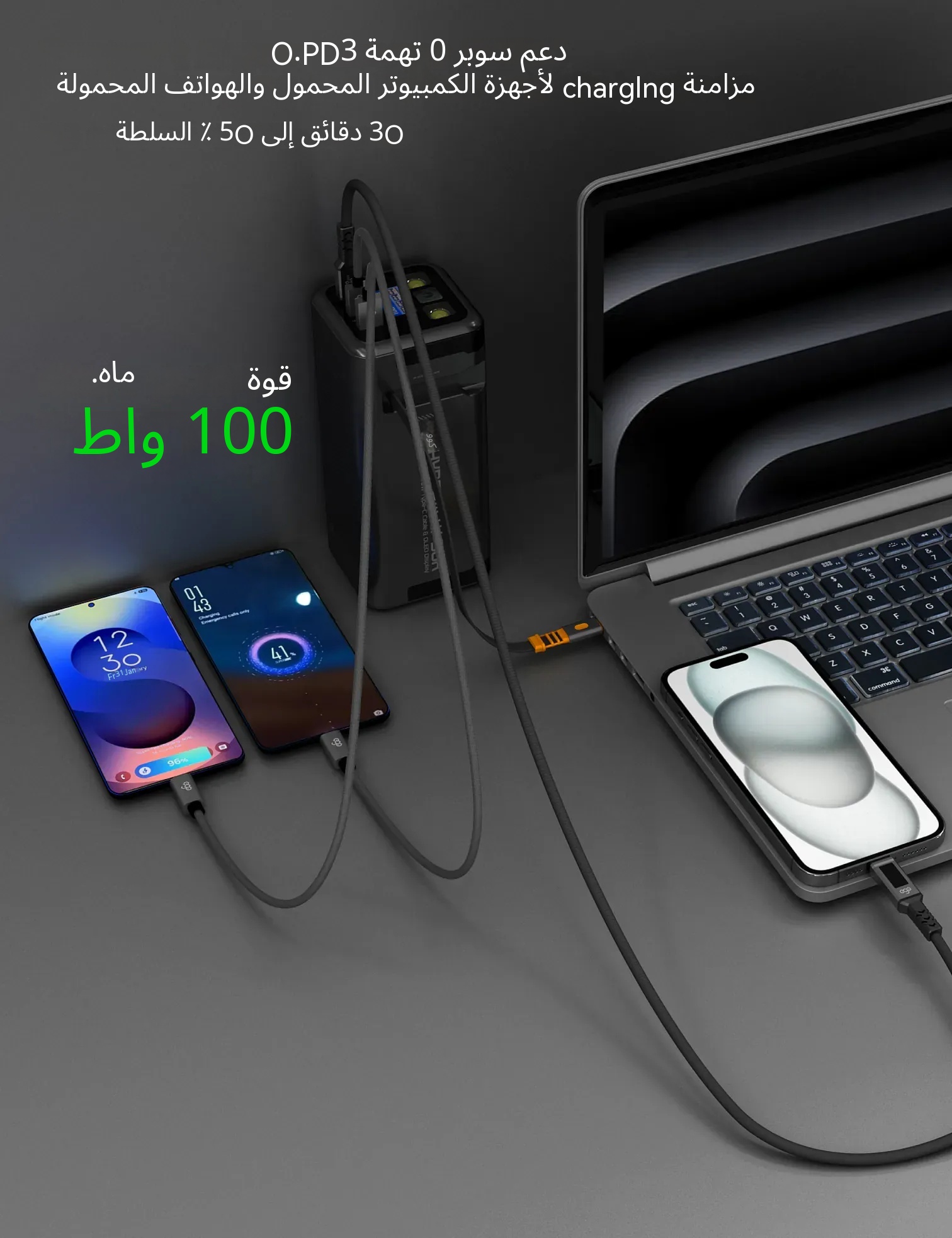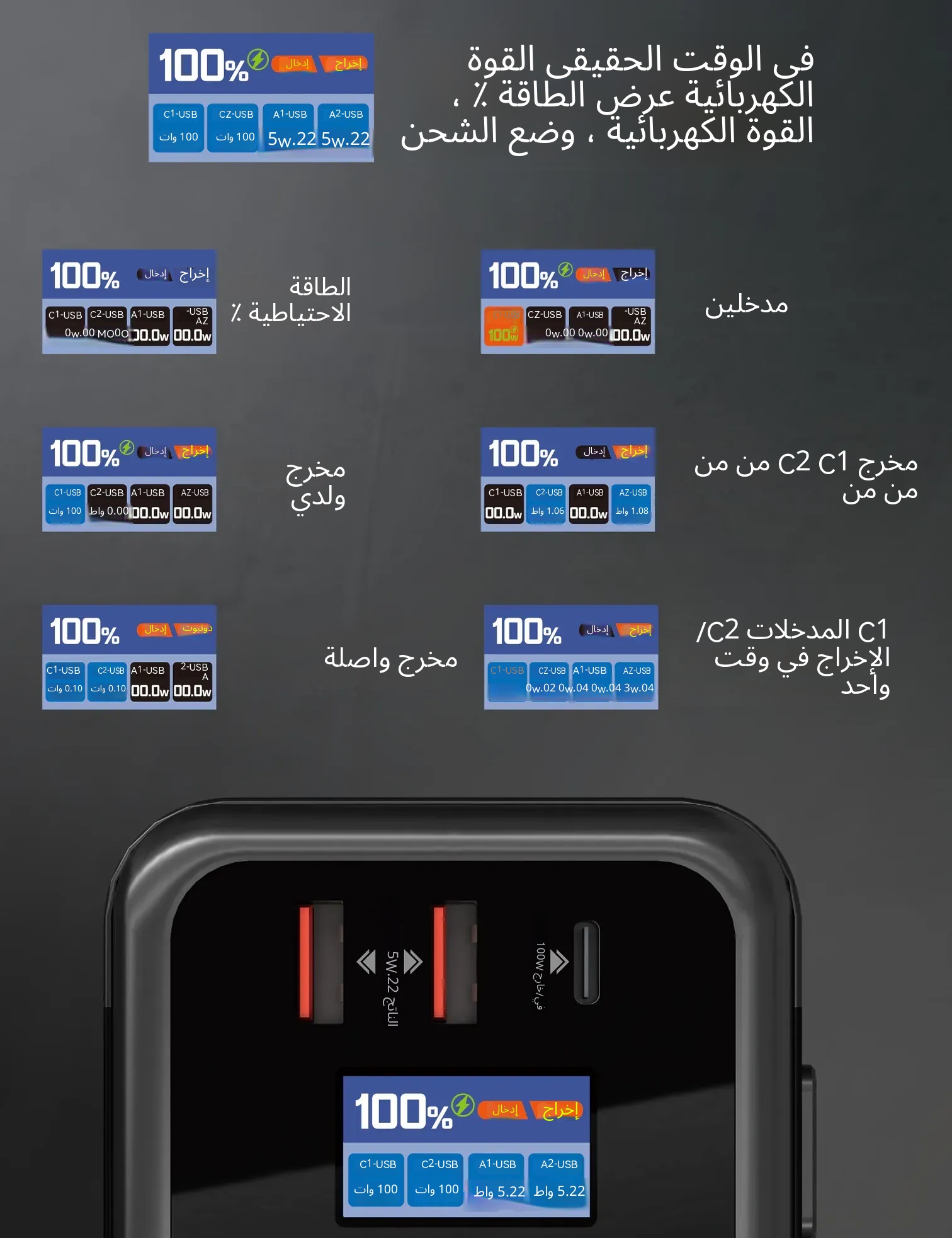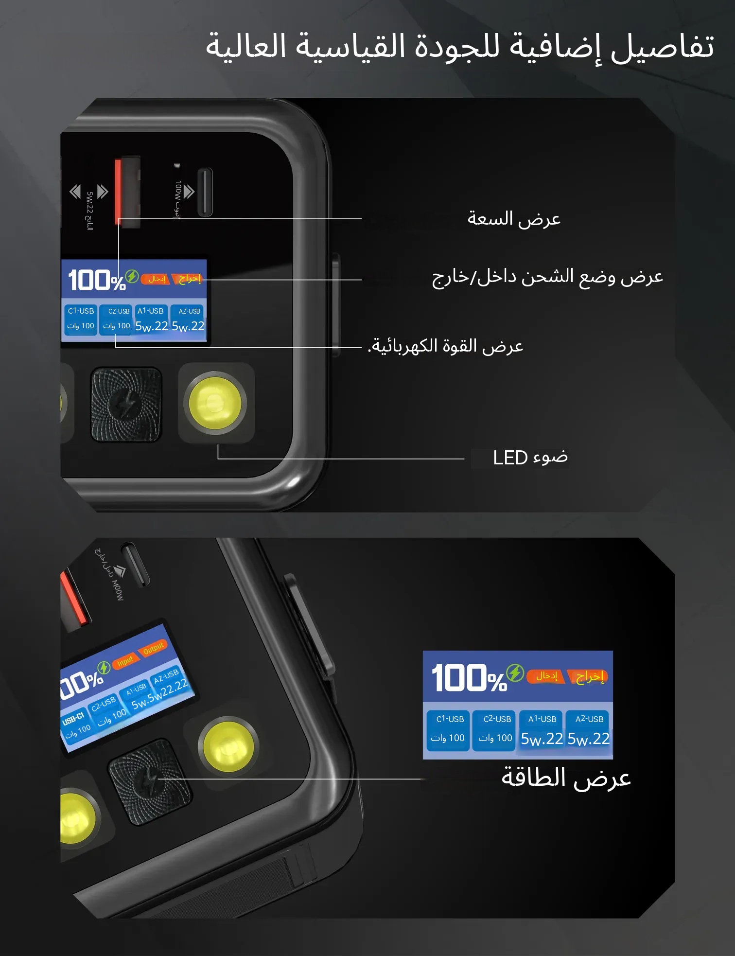 سعة بطارية كبيرة / شحن سريع 100W / شاشة OLED للمعلومات / كابل قابل للسحب مدمج بطول 65 سم / إضاءة LED مزدوجة