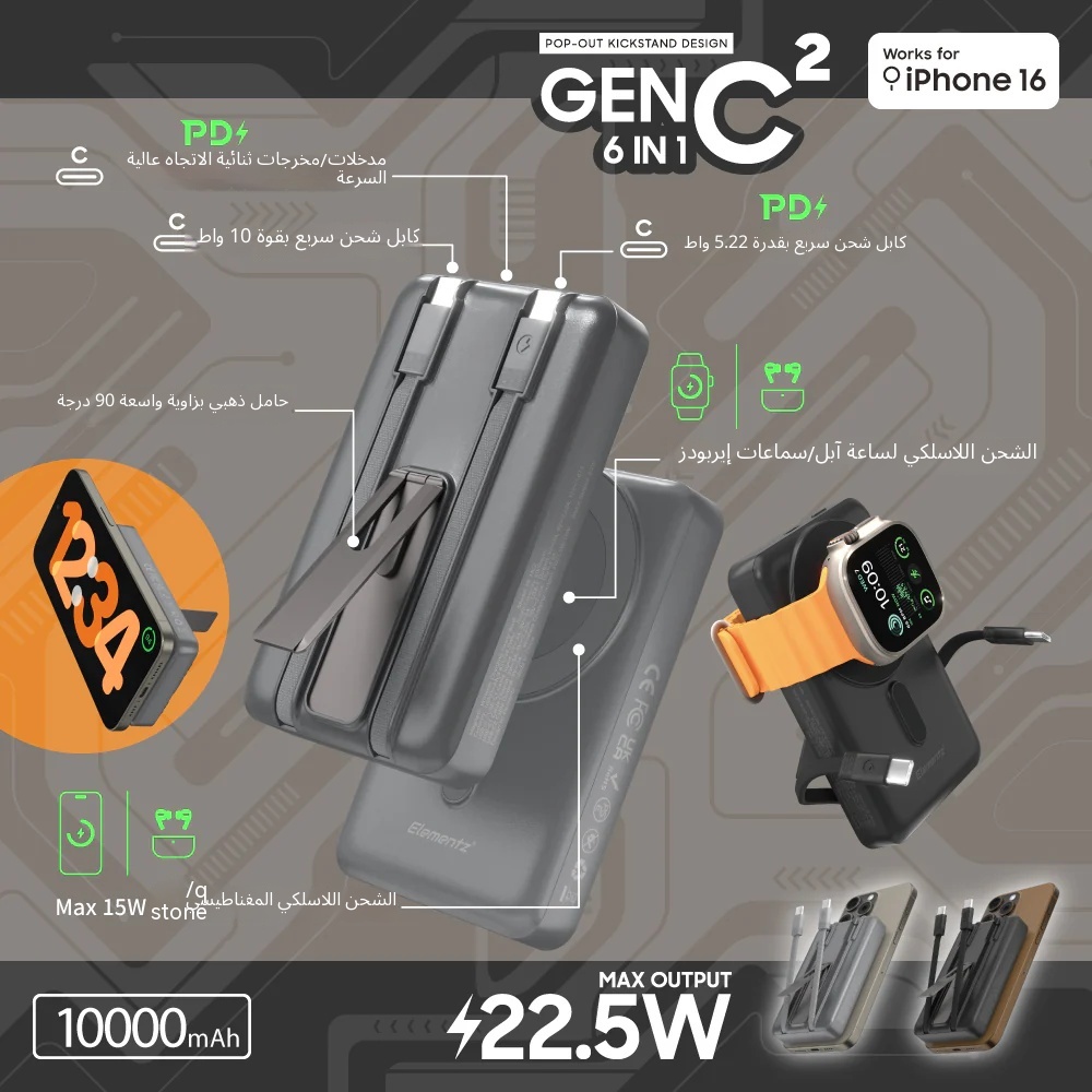 بنك طاقة لاسلكي مغناطيسي إليمنتز 10000 مللي أمبير في الساعة 6 في 1 بكابل ثنائي TYPE-C (PE-MC2) – منتج مرخص أصلي