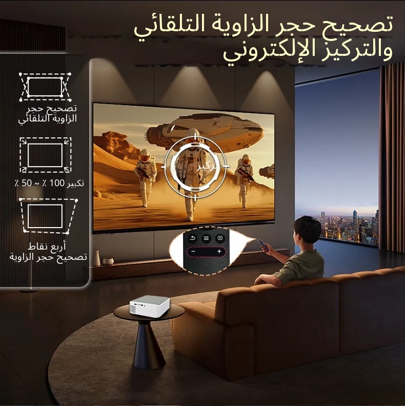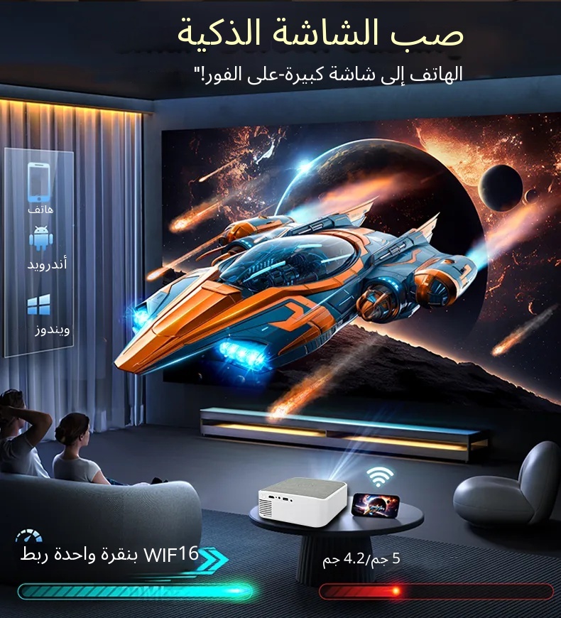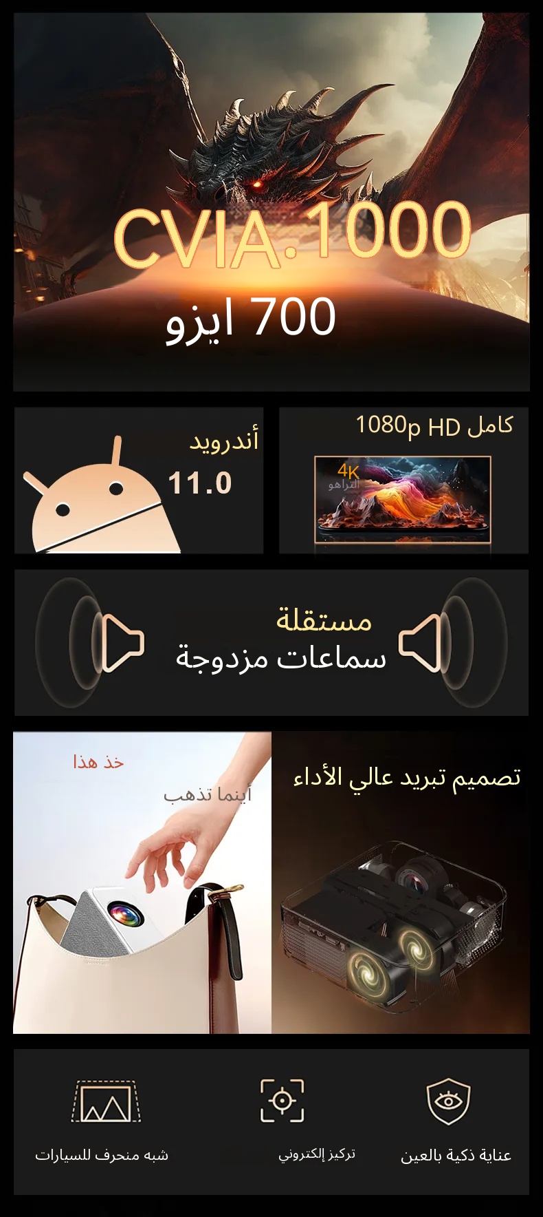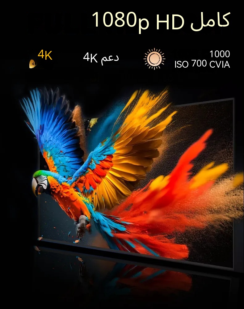 1000 CVIA / 700 IS0 Full HD نسبة تباين 1500:1 ذاكرة 2+32G نظام أندرويد التركيز: تركيز تلقائي اللون: رمادي منفذ HDMI*2/ AV/ USB*2 2.4+5G/WiFi6 يدعم 18 لغة