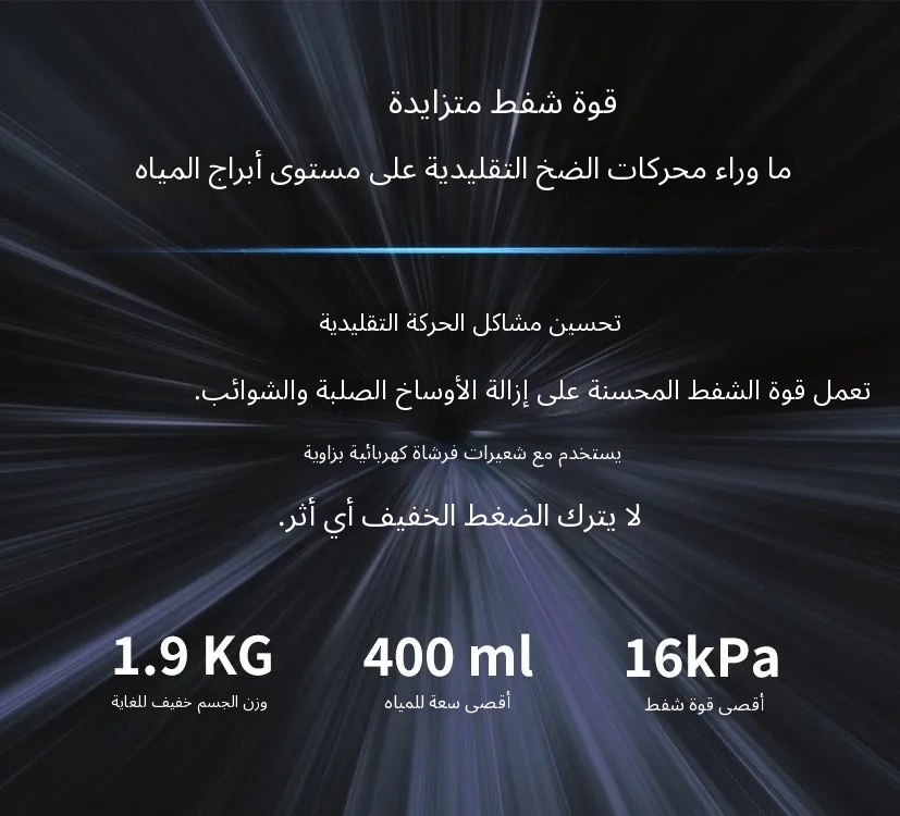 - قوة شفط 100CC، تصل إلى 3600 دورة في الدقيقة، بأقصى قوة شفط 19000 باسكال