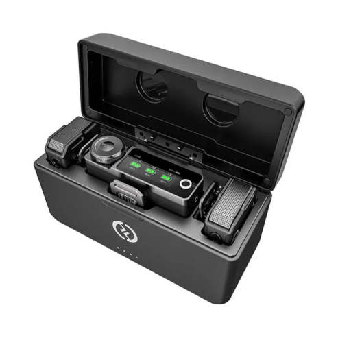 يأتي النظام مع علبة شحن مدمجة تُطيل عمر تشغيل كل مكون إلى إجمالي 22 ساعة عند الشحن الكامل. يبلغ عمر تشغيل كل جهاز إرسال نفسه 7.5 ساعات، بينما يبلغ عمر تشغيل جهاز الاستقبال 9 ساعات، ويمكن شحنه وتشغيله في نفس الوقت. يتيح لك مؤشر LED على العلبة مراقبة حالة بطاريتها.