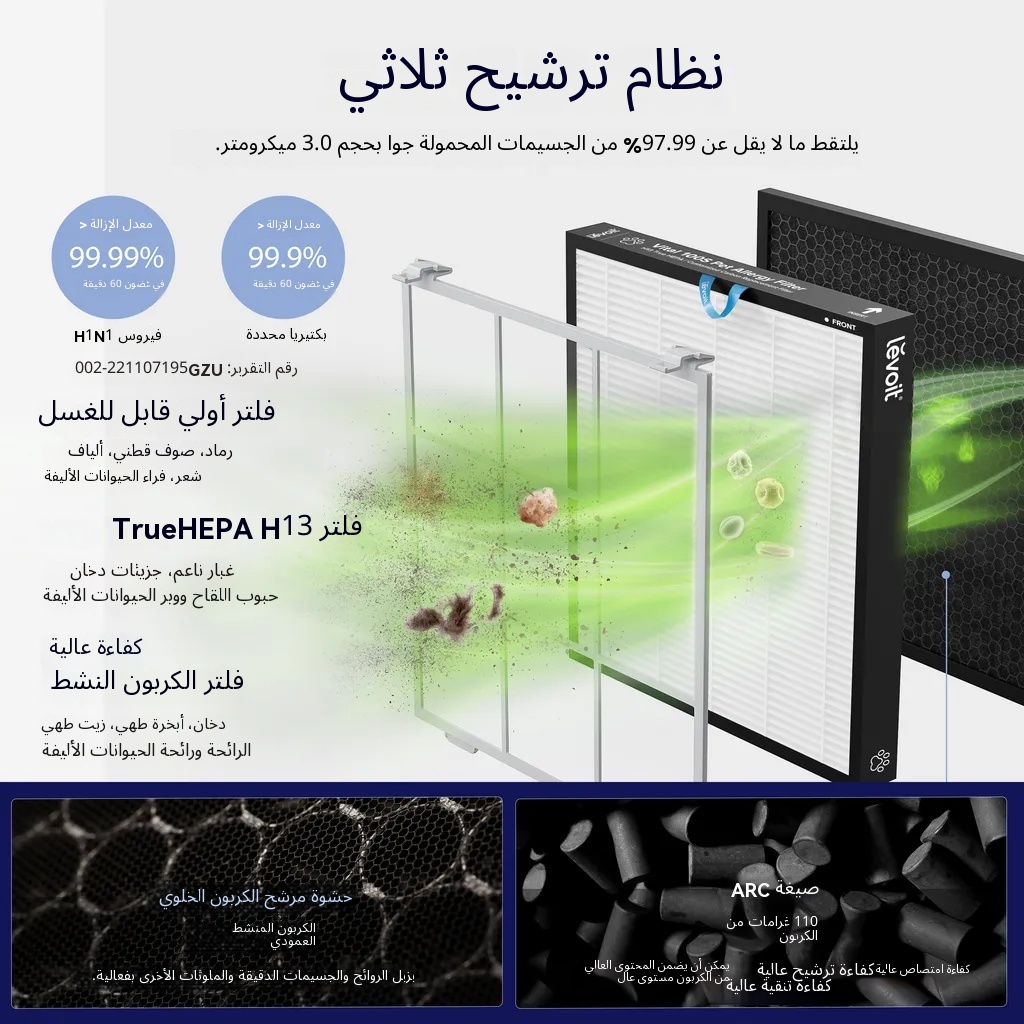【فلتر ثلاثي الطبقات لمكافحة حساسية الحيوانات الأليفة】: يساعد الفلتر الأولي القابل للغسل على إطالة عمر الفلتر. يقوم فلتر H13 True HEPA بالتقاط 99.97% من الجسيمات بحجم 0.3 ميكرومتر، مما يحبس فعالاً شعر الحيوانات الأليفة، والقشرة، وحبوب اللقاح، والغبار، وغيرها، بينما يساعد فلتر الكربون المنشط عالي الكفاءة على تحييد روائح الحيوانات الأليفة والروائح الناتجة عن الطهي.