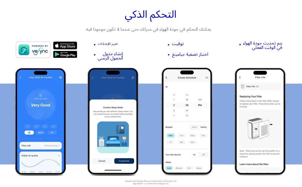 【التحكم الذكي】: باستخدام تطبيق VeSync المجاني، يمكنك التحكم في إعدادات جهاز تنقية الهواء، وضبط المؤقتات، وإنشاء الجداول الزمنية، والتحقق من عمر الفلتر، والاتصال بمساعدين صوتيين تابعين لجهات خارجية (مثل Google Assistant).