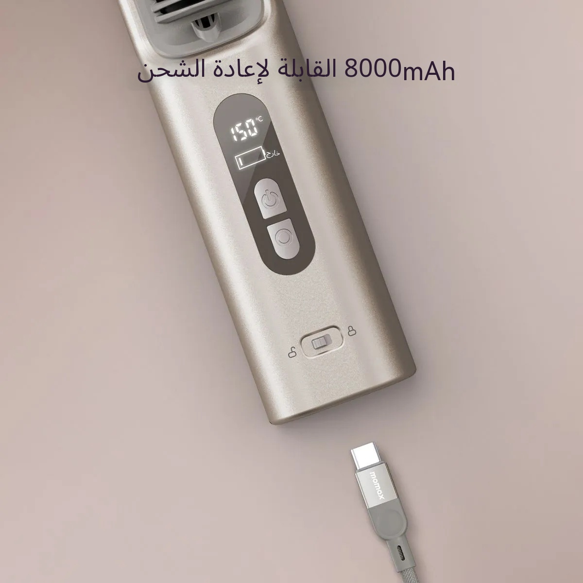 التحكم في درجة الحرارة مزود ببطارية كبيرة السعة 8000 مللي أمبير في الساعة، توفر شحنة واحدة حوالي 30 دقيقة من تجربة تصفيف فعالة ومستدامة. عند الحاجة للشحن، يمكن شحنه بالكامل في حوالي ساعتين عبر منفذ USB-C. مع 6 إعدادات ذكية لدرجة الحرارة (150°C – 200°C) وشاشة LED واضحة، سواء كان شعرك رقيقاً أو خشناً، يمكنك التحكم بسهولة وإنشاء التسريحة المثالية.