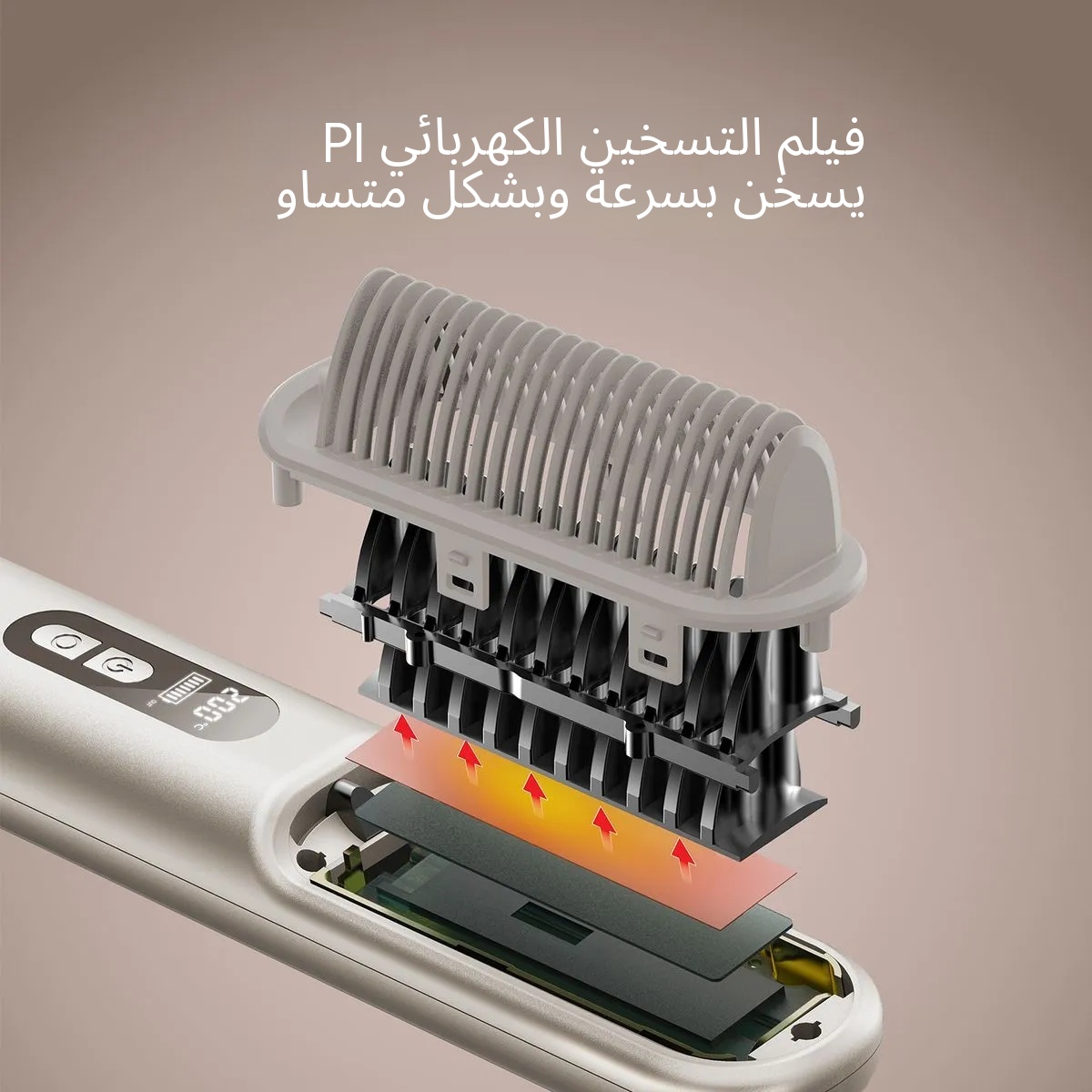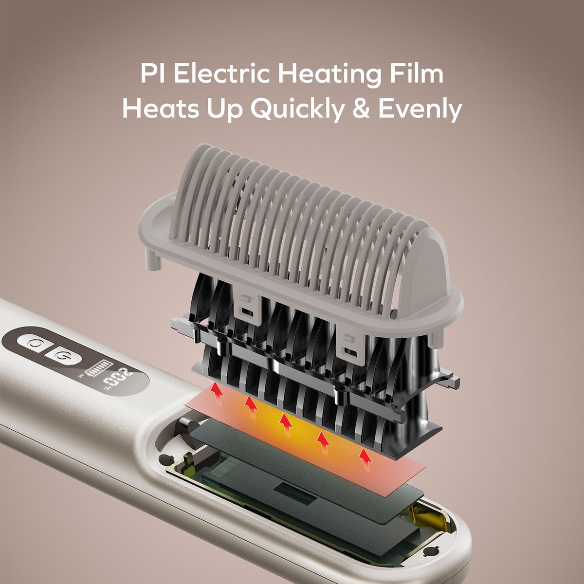 تقنية غشاء PI المتقدمة للتسخين تحقق تسخيناً سريعاً ومتساوياً، مع نقل الحرارة بشكل متساوٍ إلى كل سن من أسنان المشط، مما يضمن تصفيفاً سلساً بسهولة، لإنشاء شعر ناعم ومفرود في خطوة واحدة، مع الحفاظ على الحالة المثالية لفترة أطول، مما يجعل التصفيف أكثر كفاءة وراحة.