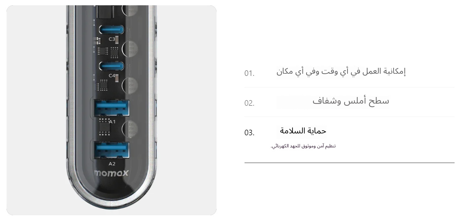 | إخراج USB-C3/C4 | 5V⎓3A, 9V⎓3A, 12V⎓3A 15V⎓3A, 20V⎓2.25A, 3.3-11V⎓4A (45W حد أقصى.) |
