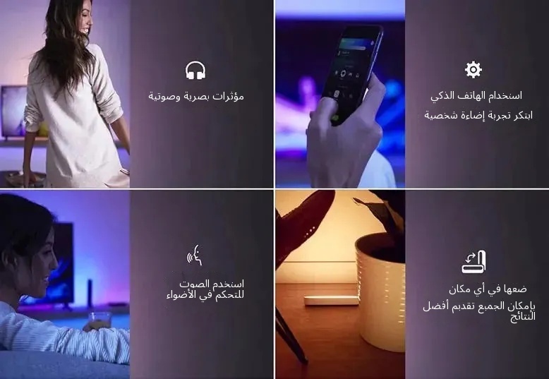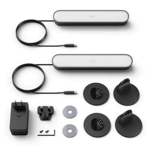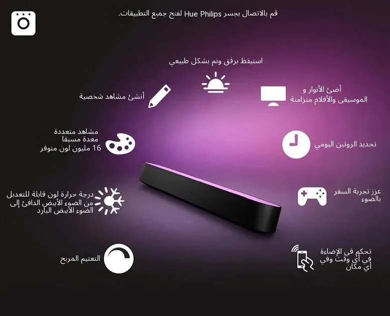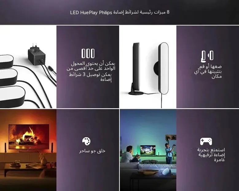 • يتضمن شريطي إضاءة ومصدر طاقة يمكنه توصيل ما يصل إلى ثلاثة أشرطة إضاءة • يمكن وضع أشرطة الإضاءة بشكل عمودي أو أفقي أو تركيبها على الجزء الخلفي من التلفزيون باستخدام الحامل المرفق • إضاءة بيضاء وملونة • يتطلب الاستخدام مع Hu…