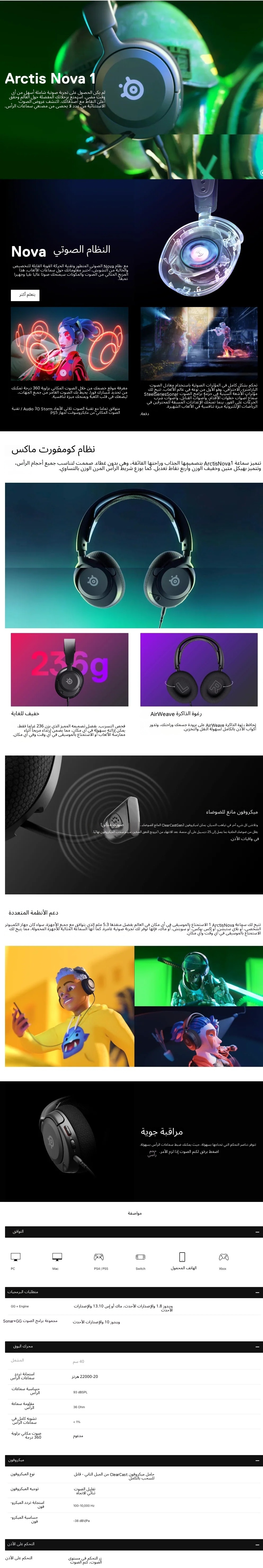 | معلومات إضافية | يدعم Xbox و PC و Mac و PlayStation أو Switch / تحقيق مستويات صوت كاملة مع نظام Nova Pro Acoustic System ومكبرات الصوت الخالية من التشويش المتفوقة المعززة ببرنامج Sonar / يعمل مع أي منصة كمبيوتر شخصي وألعاب مع موصل 3.5 ملم، مثالي للأجهزة المحمولة أثناء التنقل / ميكروفون إلغاء الضوضاء ClearCast الجيل الثاني يقضي على الضوضاء الخلفية وأصوات لوحة المفاتيح لاتصال صوتي نقي، الميكروفون بتصميم قابل للسحب بالكامل |