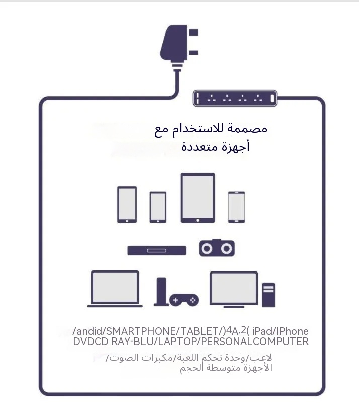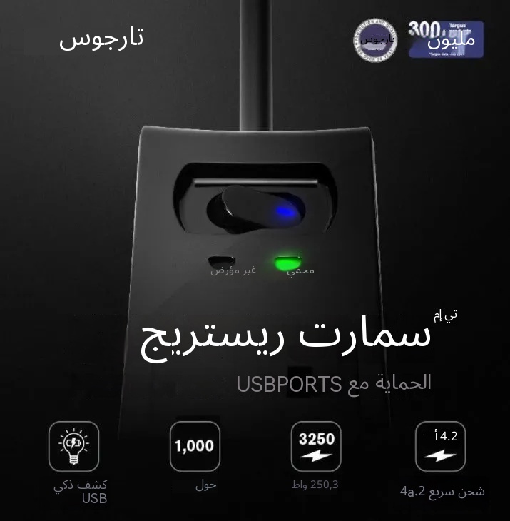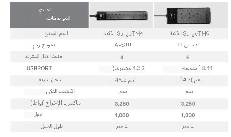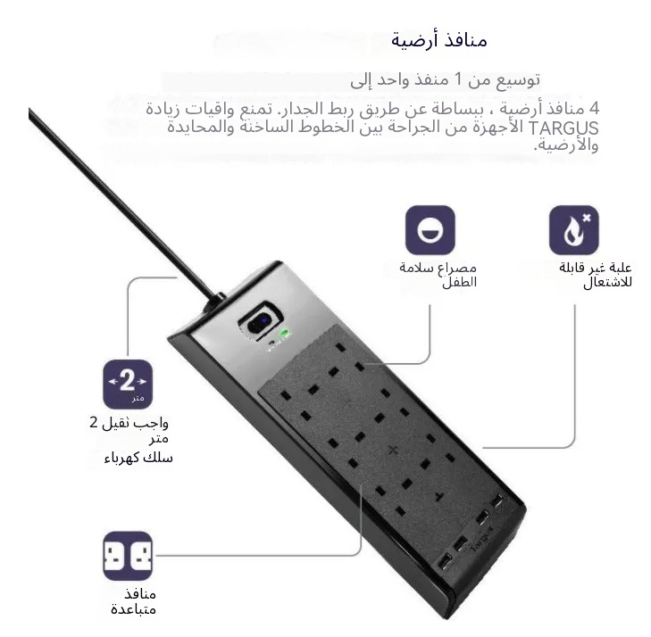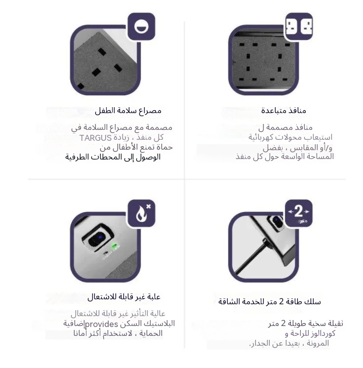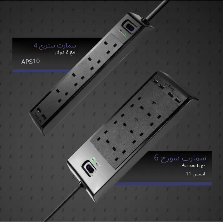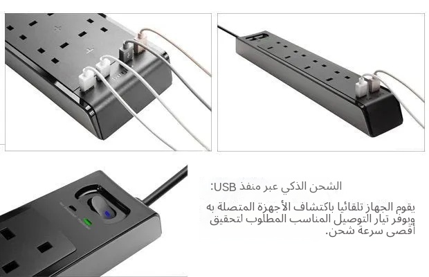 مميزات المنتج 4 مقابس طاقة بريطانية 2 منفذ USB (12 واط / 2.4 أمبير) حماية من التدفق الكهربائي حتى 1000 جول أقصى إخراج يصل إلى 250 فولت، 13 أمبير أو 3,250 واط منافذ USB ذكية للشحن تضبط الطاقة تلقائيًا بالنسبة للأجهزة الإلكترونية 2 مي…
