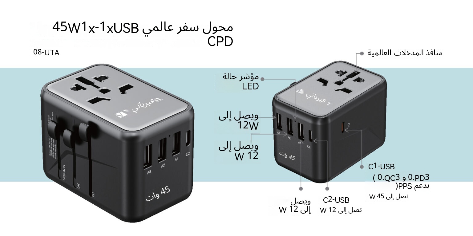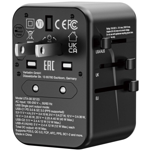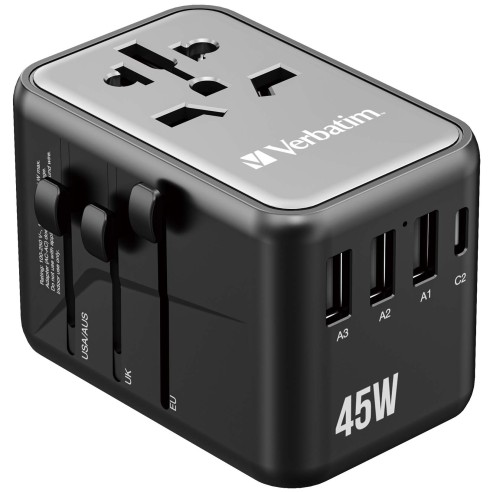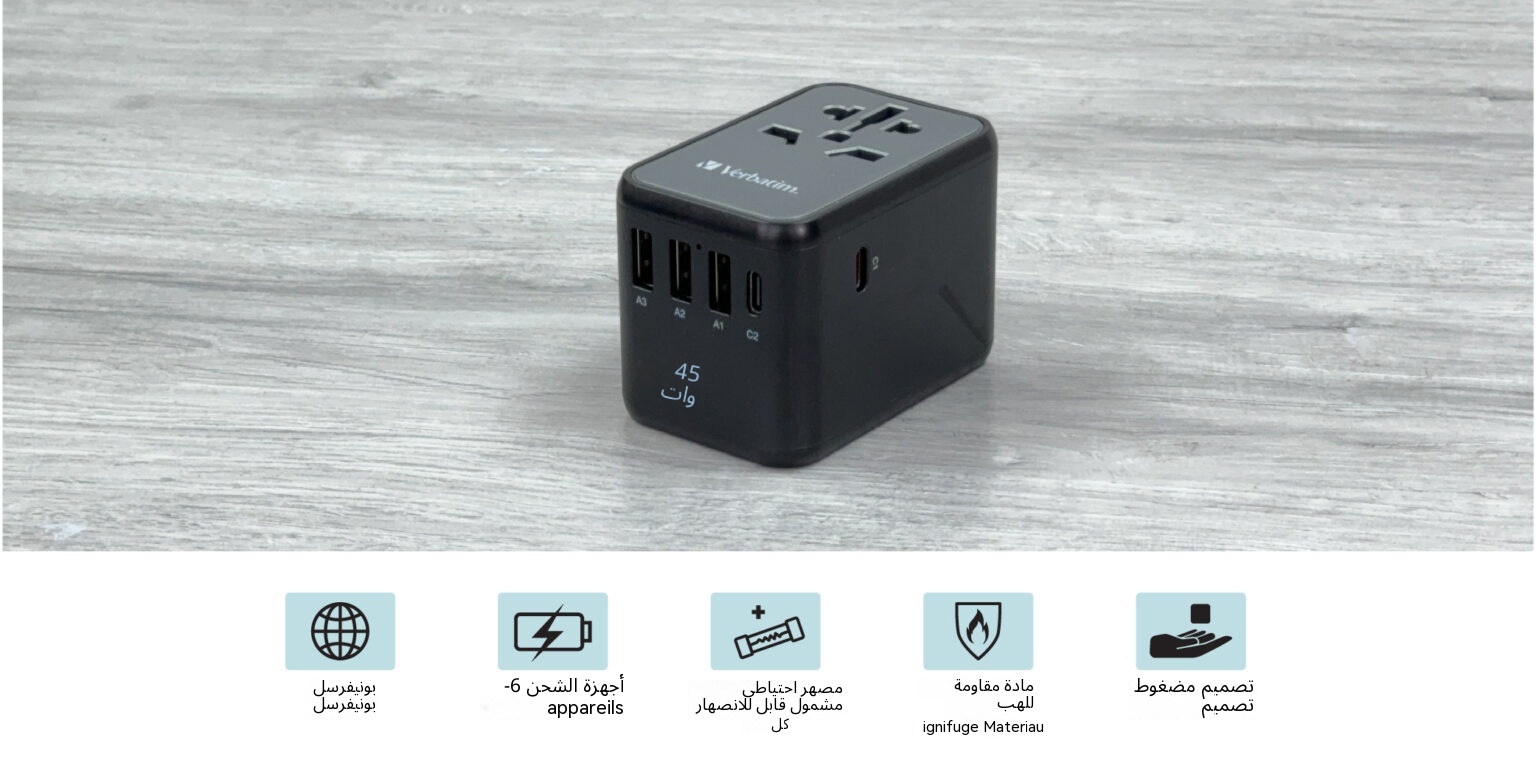 يمكن استخدام محول السفر العالمي من Verbatim (UTA-08) في أكثر من 180 دولة ومنطقة، ويمكنه توفير إمداد لا نهاية له من الطاقة أينما ذهبت. يأتي المحول مع مجموعة متنوعة من القوابس لتوصيلك بمصادر الطاقة المحلية حول العالم ويمكنه شحن الأجهزة ذات استهلاك الطاقة العالي مثل أجهزة الكمبيوتر المحمولة وبطاريات الكاميرا. تقوم منافذ USB-C و USB-A في الأسفل بشحن أجهزة USB الخاصة بك، بما في ذلك الهواتف الذكية، وأجهزة البلوتوث، والأجهزة اللوحية، والشواحن الخارجية، والكتب الإلكترونية.
