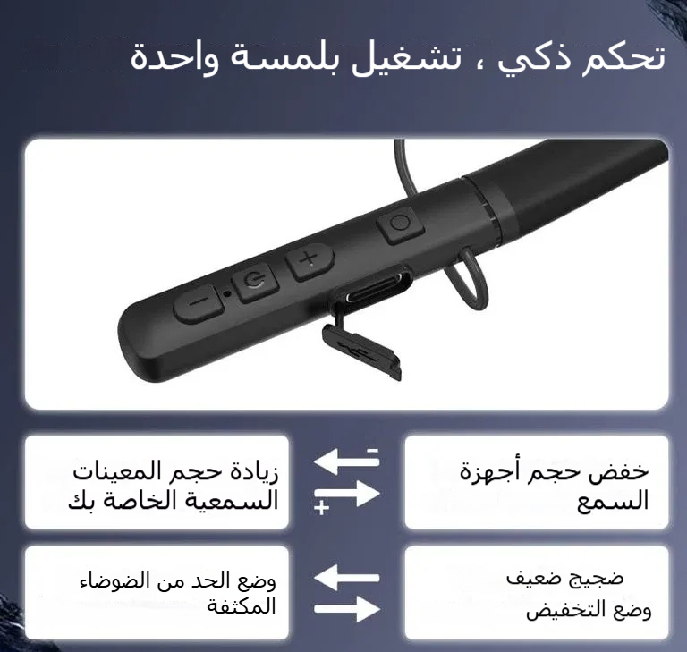 – وضعان للاستماع: ① عادي ② تقليل الضوضاء المحسّن (⚪ زر تبديل الوضع)