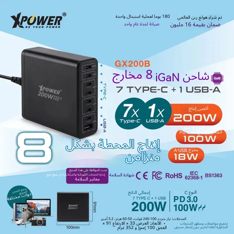 شاحن سطحي XPOWER GX200B بقوة 200 واط و8 منافذ بتقنية GaN وPD3.0/PPS