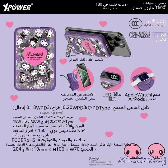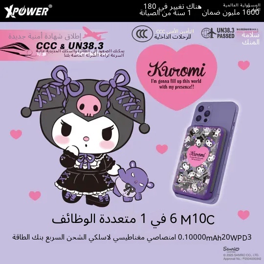 بنك طاقة XPower x Sanrio Kuromi M10C+ متعدد الوظائف 6 في 1 سعة 10000mAh مع شحن سريع لاسلكي مغناطيسي 20W PD3.0+ (معتمد 3C)