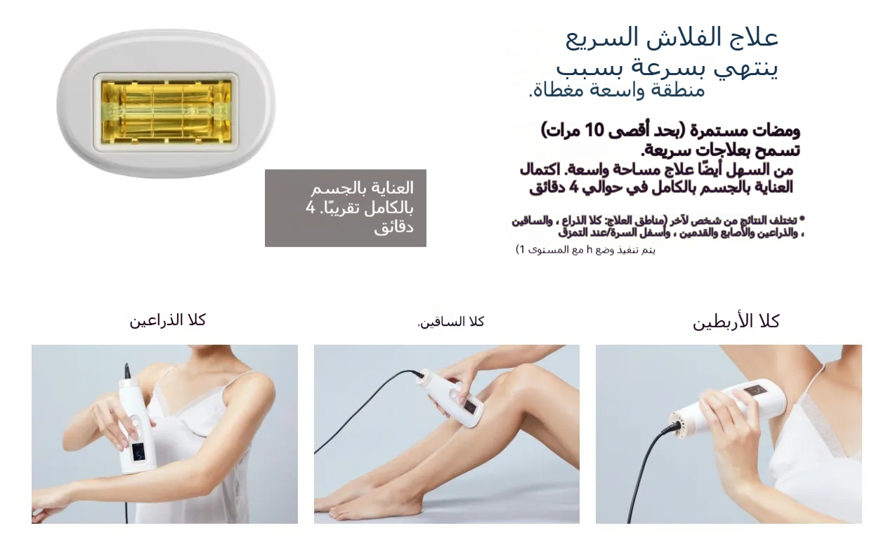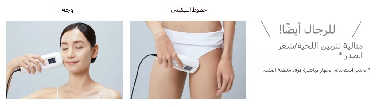 – المناطق القابلة للاستخدام: الذراعين، الإبطين، الساقين، خط البيكيني، الوجه، اللحية