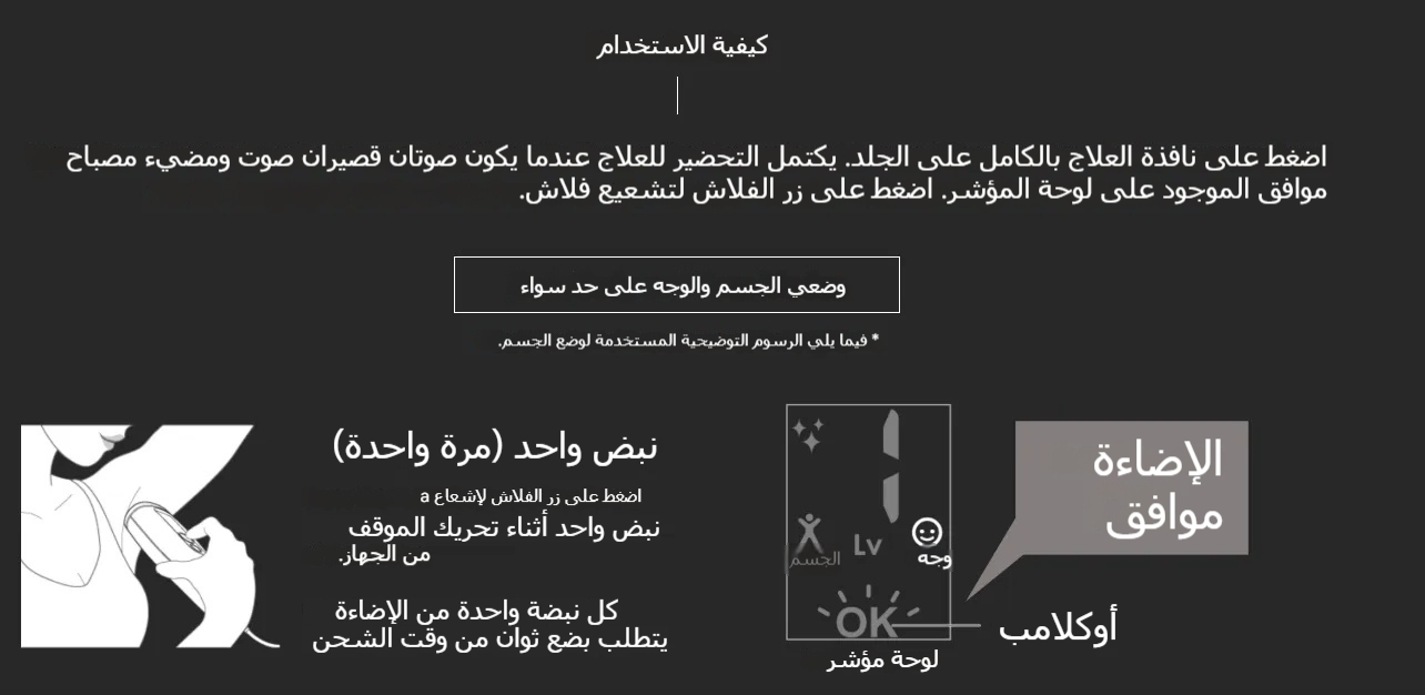 بمجرد التأقلم مع هذا المستوى، زد تدريجيًا إلى مستوى أعلى. من الطبيعي الشعور بدفء خفيف من نبضة الفلاش، ولن يسبب أي مشاكل في البشرة.