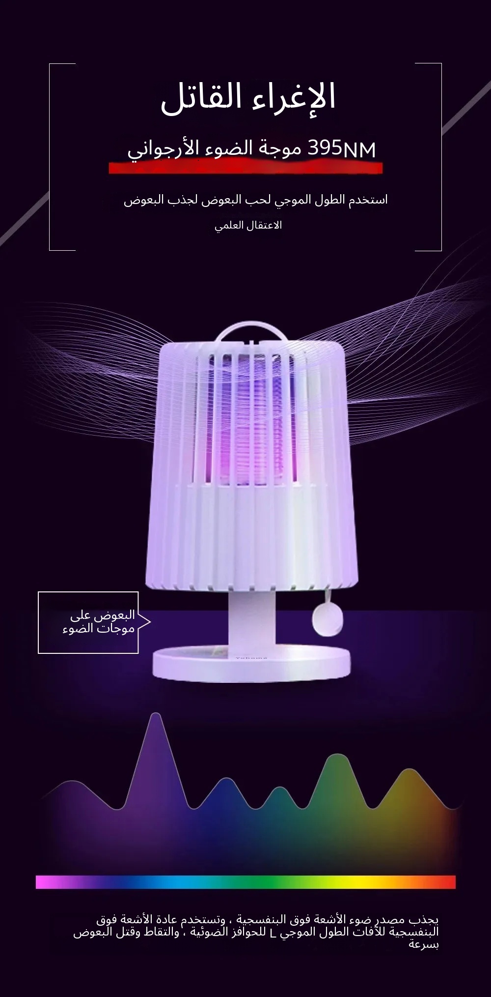 - يستخدم هذا الجهاز موجات ضوئية ذكية بقدرة 395 نانومتر مع تقنية تردد متغير لاصطياد البعوض الذكور والإناث وقتلها بقوة الشفط القوية.
